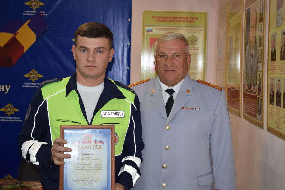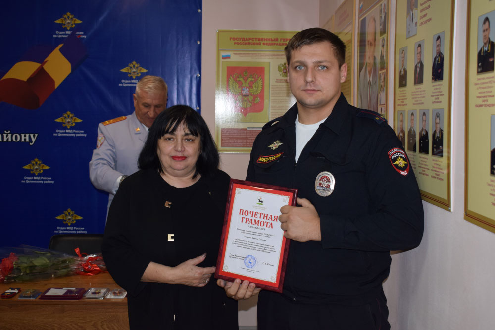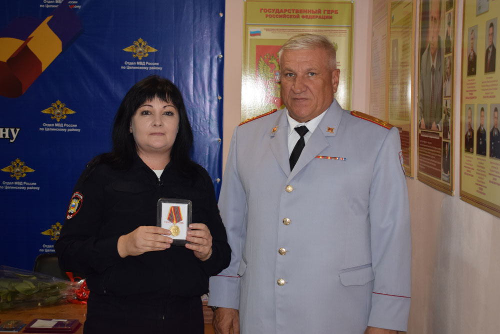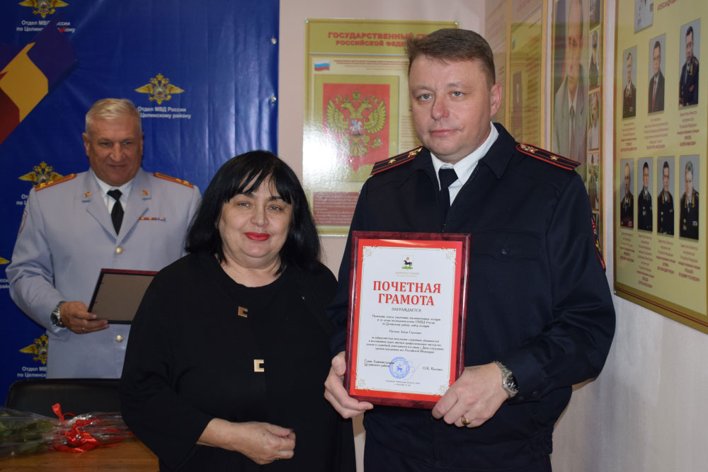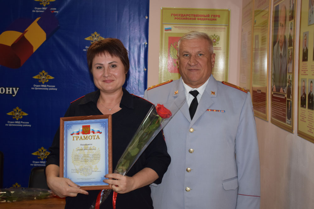 Заместитель главы администрации Целинского района вручила стражам правопорядка Почетные грамоты.