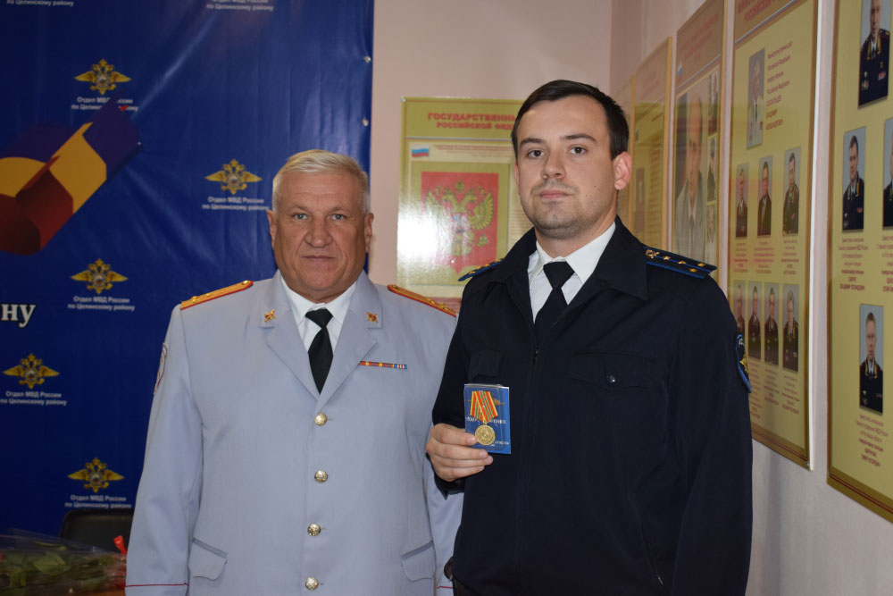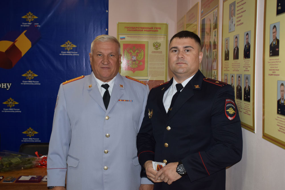 Сотрудники ОМВД получили также ведомственные знаки отличия, новые звания и грамоты ОМВД РФ по Целинскому району. Это награждение провел Владимир Бондаренко.