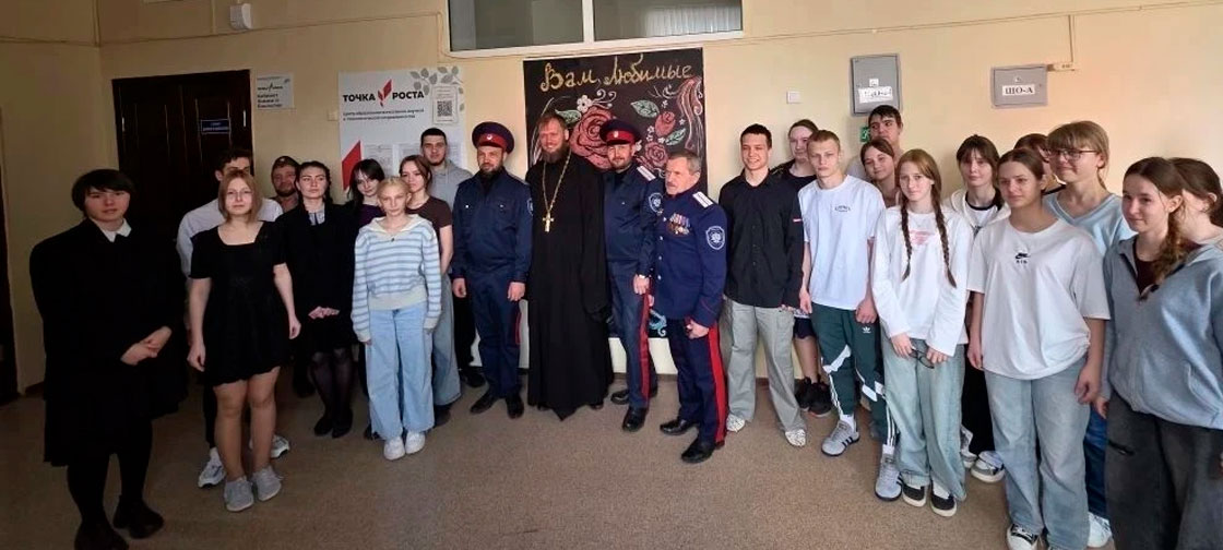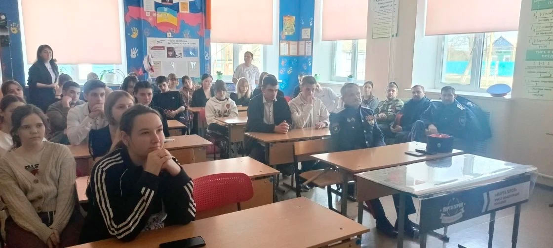 На встречу со школьниками также приехали и приняли участие в беседе казаки СКО «Целинская» атаман Андрей Буцкий и его заместитель, первый товарищ атаман Владимир Лукьянов, ХКО «Вороново» — атаман Александр Сметанин, первый помощник атамана, ветеран боевых действий, участник СВО Алексей Сметанин.