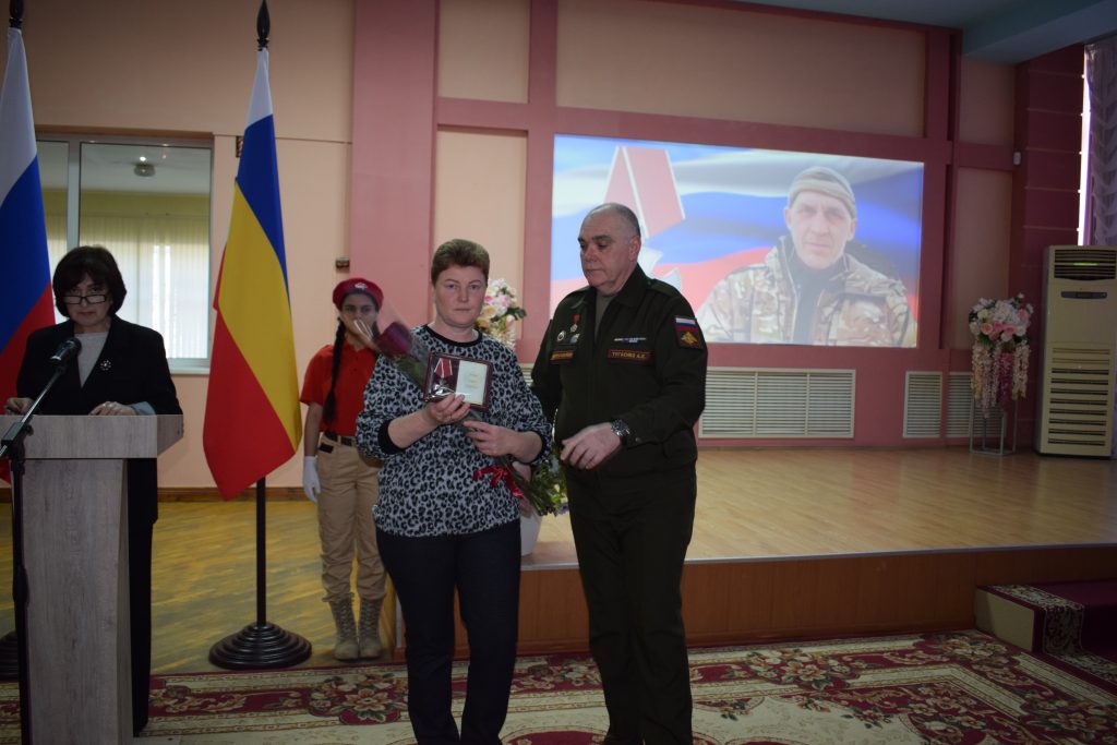 Помощник военного комиссара Сальского, Песчанокопского и Целинского районов Алексей Тугаенко передал ордена Мужества жене Сергея Попова Дарье, маме Вячеслава Безручко Людмиле Владимировне, медаль Суворова жене Сергея Лисицына Наталье и медаль «За храбрость» жене Артема Глояна Ольге.