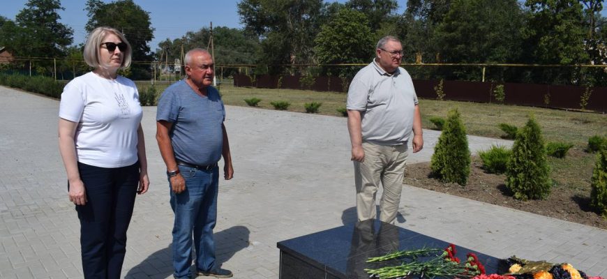 Глава Администрации Целинского района Оксана Косенко и глава администрации Ольшанского сельского поселения Валерий Велитарский возложили цветы к памятнику погибшим воинам