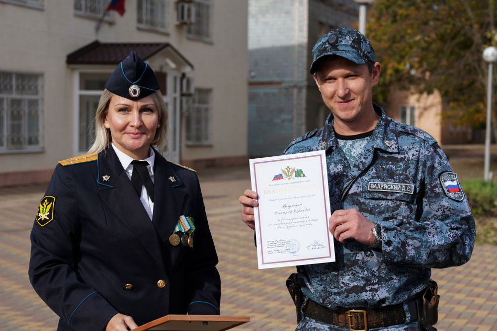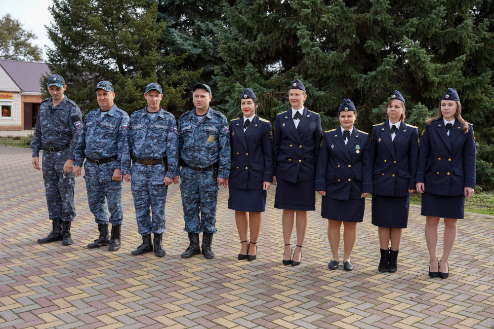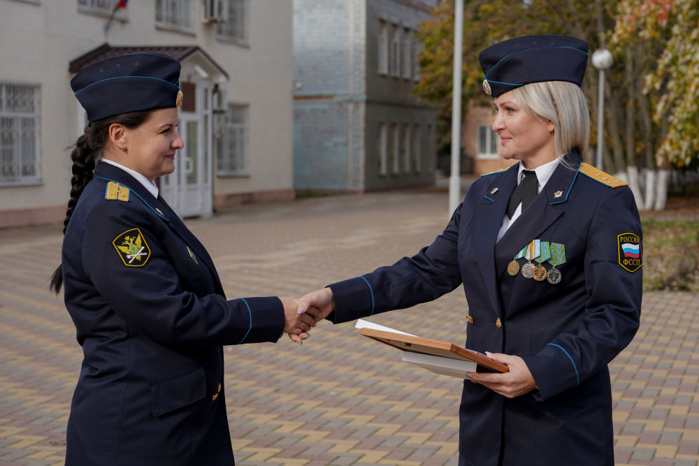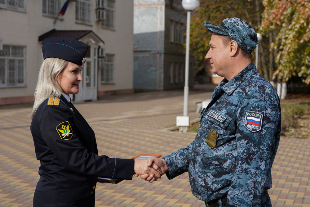 Руководитель отделения Елена Тарасова вручила награды старшему смены на объекте, капитану внутренней службы Виктору Корнееву, младшему судебному пристав по ОУПДС младшему лейтенанту Дмитрий Валуйскому, судебному приставу-исполнителю старшему лейтенанту внутренней службы Светлане Корнеевой.